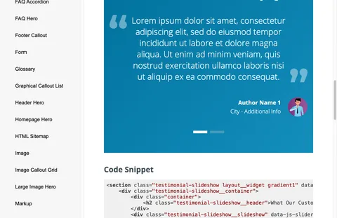 - Clarity Design System. Built a full design system encompassing brand principles, guidelines, and 39 documented widgets, each with responsive previews (desktop, tablet, mobile), usage guidance, and syntax-highlighted code snippets. The design system pages are themselves editable in the same Umbraco CMS, and components automatically pull in realistic data so they look representative out of the box, while still allowing editors to override content for fully freeform pages.