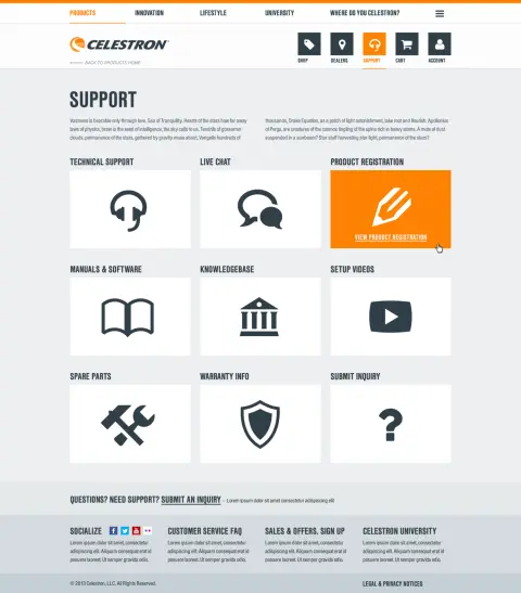 I built Celestron.com entirely in ASP.NET MVC in the Umbraco CMS using C# razor syntax. To speed up load times, all pages use MVC donut caching. I opted to use donut caching rather than the built-in output caching, because some elements of the page are dynamic on a per-user basis (e.g., the shopping cart indicates the number of items in the cart). Some interesting aspects I built for the site include: